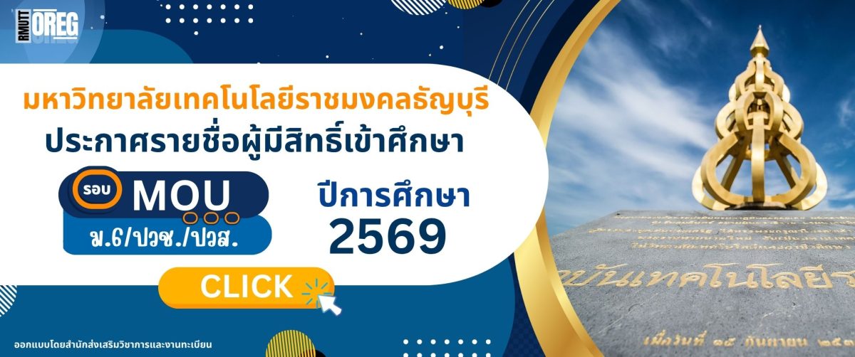 ประกาศรายชื่อผู้มีสิทธิ์เข้าศึกษา MOU ระดับปริญญาตรี ปีการศึกษา 2569    มหาวิทยาลัยเทคโนโลยีราชมงคลธัญบุรี ประกาศผู้มีสิทธิเข้าศึกษาระดับปริญญาตรี รอบ MOU ปีการศึกษา 2569 ประกาศ ณ วันที่ 29 ต.ค. 68 เวลา 18.30 น. สามารถดูรายละเอียดขั้นตอนการขึ้นทะเบียนและลงทะเบียนเรียนเพิ่มเติมได้ที่ท้ายประกาศ