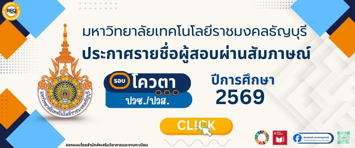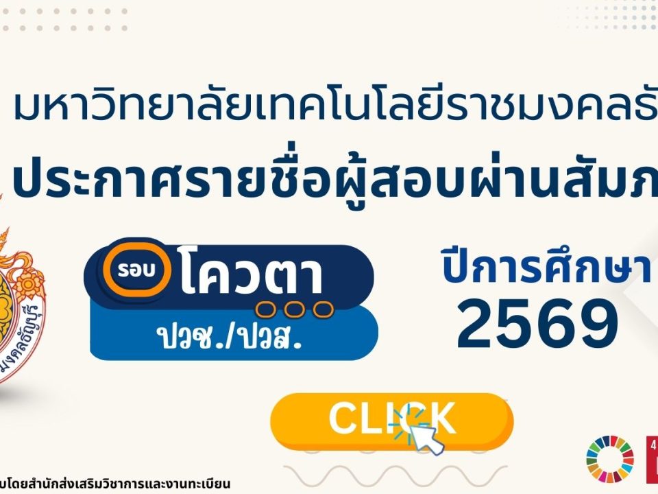มหาวิทยาลัยเทคโนโลยีราชมงคลธัญบุรี ประกาศรายชื่อผู้สอบผ่านสัมภาษณ์ โควตา(ปวช./ปวส.) ระดับปริญญาตรี ปีการศึกษา 2569 (ประกาศ ณ วันที่ 30 ธ.ค.68 เวลา 16.00 น.) รายละเอียดเพิ่มเติม คลิก