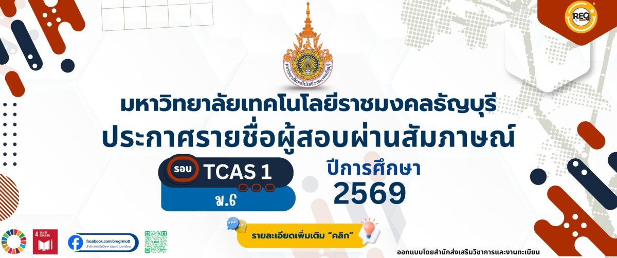 มหาวิทยาลัยเทคโนโลยีราชมงคลธัญบุรี ประกาศรายชื่อผู้มีสิทธิ์สอบสัมภาษณ์ รอบ TCAS1 (Portfolio) ระดับปริญญาตรี ปีการศึกษา 2569 ประกาศ ณ วันที่ 13 ธันวาคม 2568 เวลา 16.00 น. รายละเอียดเพิ่มเติมคลิก