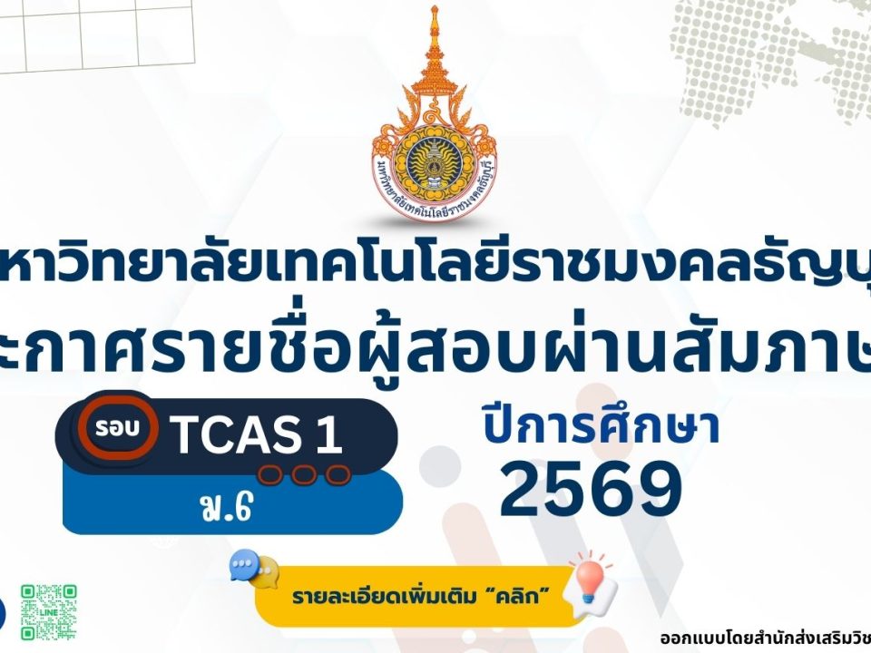 มหาวิทยาลัยเทคโนโลยีราชมงคลธัญบุรี ประกาศรายชื่อผู้สอบผ่านสัมภาษณ์ TCAS1 ระดับปริญญาตรี ปีการศึกษา 2569 (ประกาศ ณ วันที่ 30 ธ.ค.68 เวลา 16.00 น.) รายละเอียดเพิ่มเติม คลิก