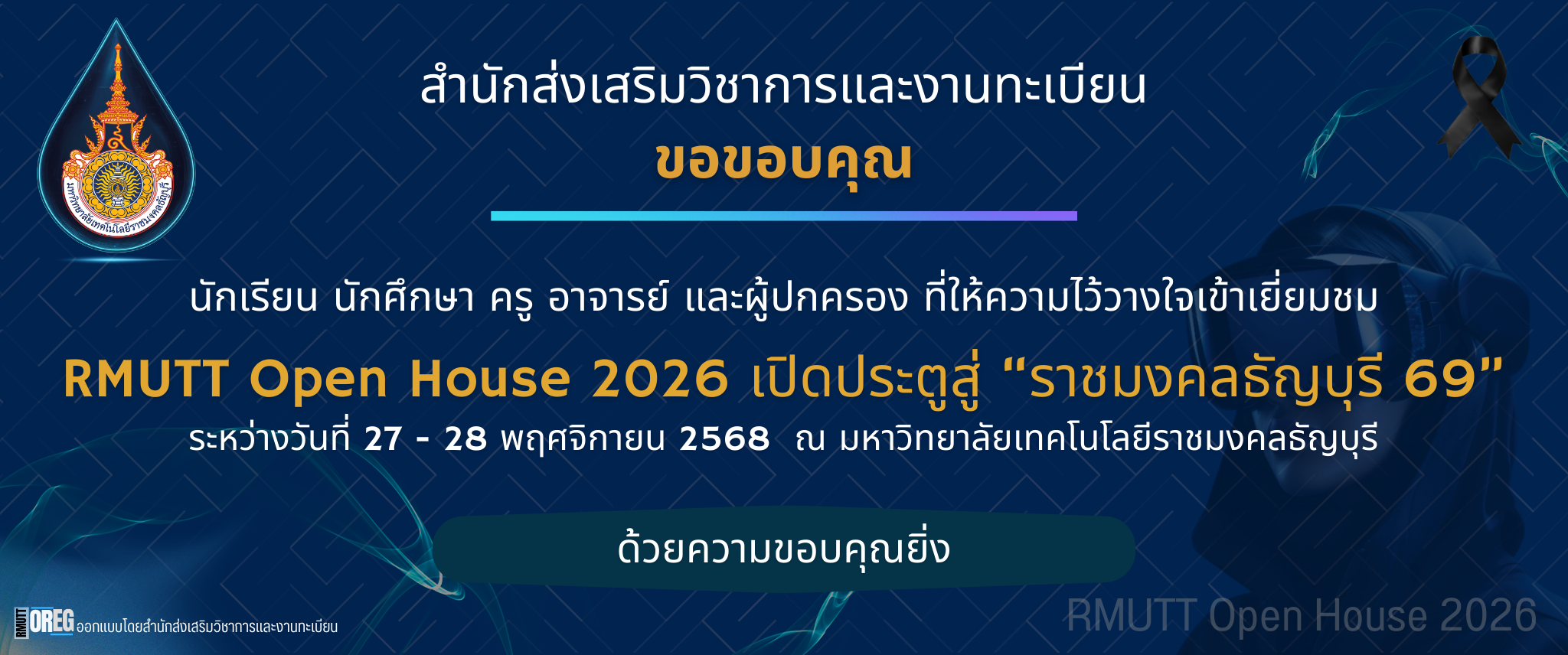 เปิดประตูสู่ “ราชมงคลธัญบุรี 69” สำนักส่งเสริมวิชาการและงานทะเบียน ขอขอบคุณนักเรียน คุณครู ผู้ปกครอง และทุกท่าน ที่ให้เกียรติเข้าร่วมงาน RMUTT Open House 2026 – เปิดประตูสู่ “ราชมงคลธัญบุรี 69” ตลอดสองวันที่ผ่านมา ขอบคุณสำหรับพลังบวก รอยยิ้ม และความตั้งใจในการมาค้นหาเส้นทางอนาคตของตัวเองที่ มทร.ธัญบุรี ขอขอบคุณน้องๆ นักศึกษาทุกคณะ อาจารย์ ทีมงานของมหาวิทยาลัย […]