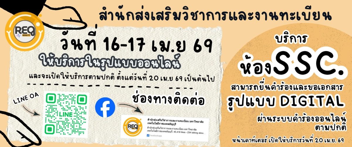 สำนักส่งเสริมวิชาการและงานทะเบียน แจ้งการให้บริการในรูปแบบออนไลน์ ในวันที่ 16-17 เมษายน 2569 บริการห้อง SSC สามารถยื่นคำร้องและขอเอกสาร รูปแบบ DIGITAL ผ่านระบบคำร้องออนไลน์ ได้ตามปกติ สำนักส่งเสริมวิชาการและงานทะเบียน และห้อง SSC เปิดให้บริการตามปกติ ตั้งแต่วันที่ 20 เมษายน 69 เป็นต้นไป สามารถติดต่อสอบถามได้ที่ Line OA […]