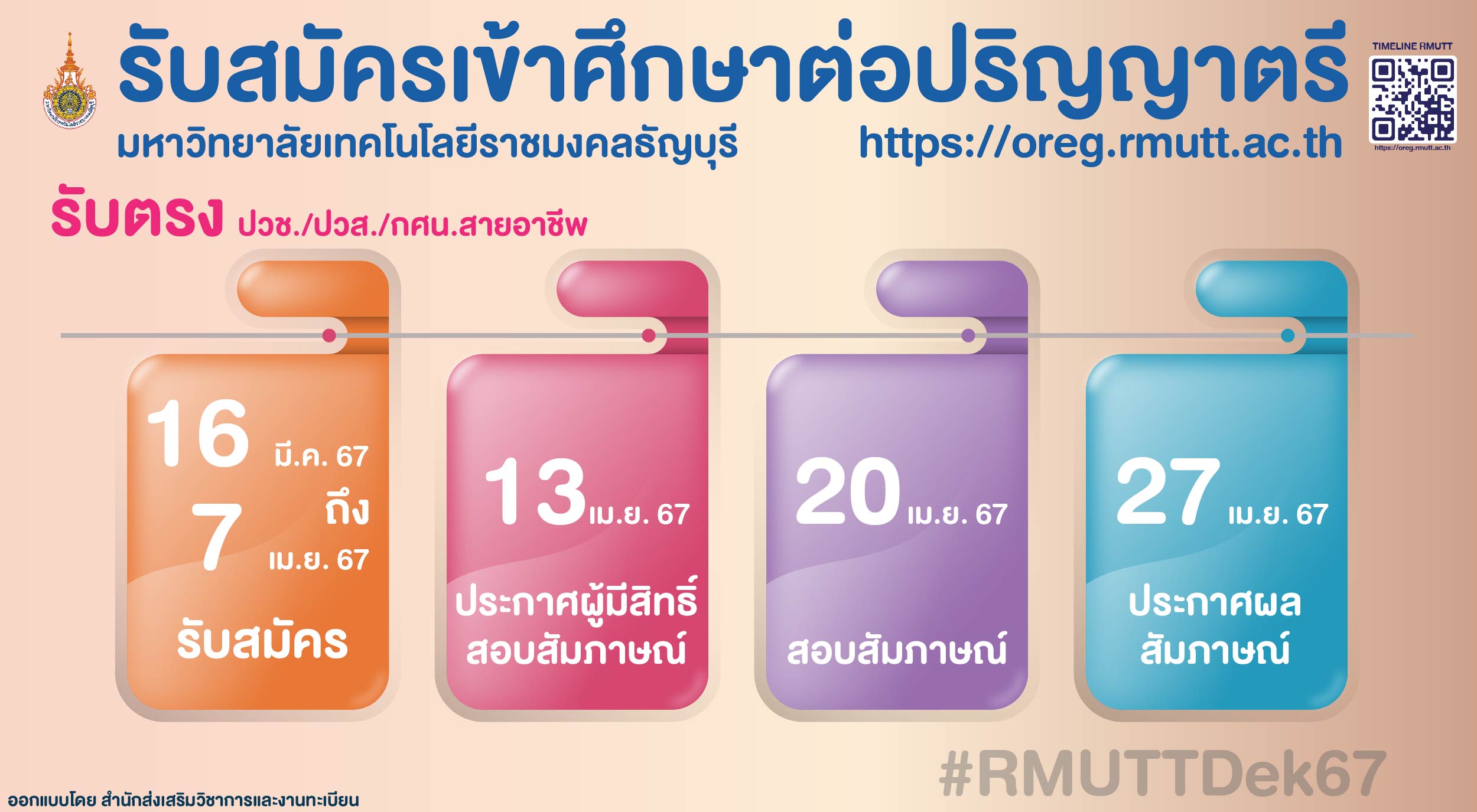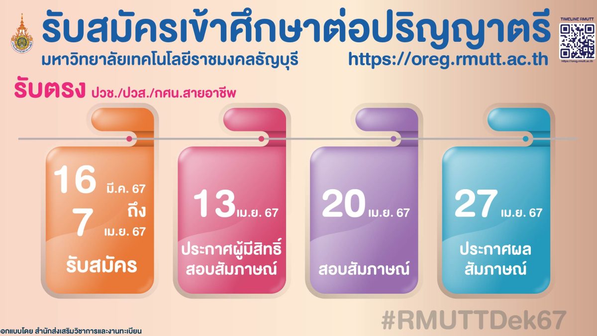 มหาวิทยาลัยเทคโนโลยีราชมงคลธัญบุรี เปิดรับสมัคร ป.ตรี รอบรับตรง ปี 67 สำหรับสายอาชีพ (ปวช./ปวส./กศน.สายอาชีพ) เปิดโอกาสครั้งสำคัญ ให้กับผู้สมัครทุกเพศจากสายอาชีพมีโอกาสในการเติบโตในระดับปริญญาตรีอย่างเสมอภาค มหาวิทยาลัยเชื่อมั่นในการให้โอกาสที่เท่าเทียมและสนับสนุนการเติบโตของผู้เรียนทุกคนสู่การเป็นบุคลากรคุณภาพ
