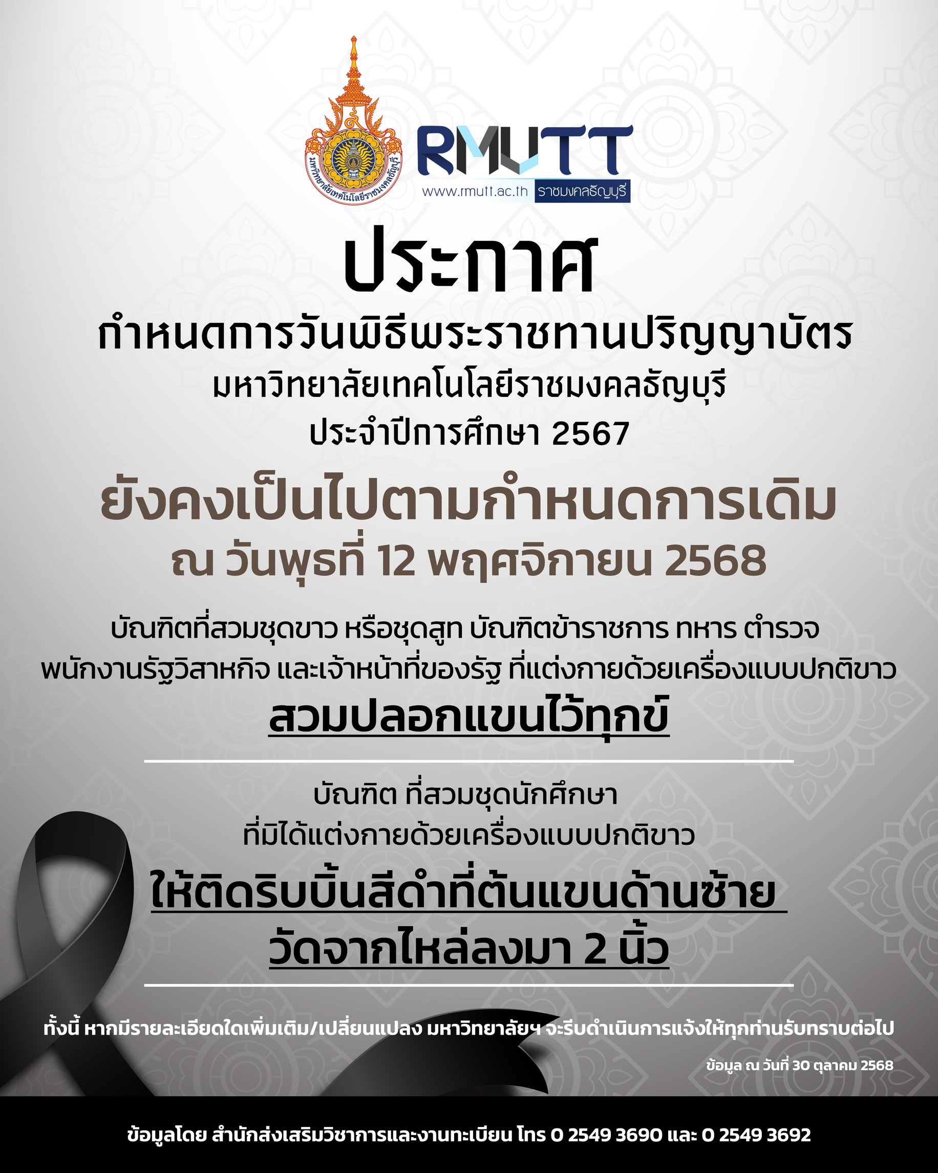 มหาวิทยาลัยเทคโนโลยีราชมงคลธัญบุรี ประกาศกำหนดการพิธีเข้ารับพระราชทานปริญญาบัตร ครั้งที่ 39 ประจำปีการศึกษา 2567