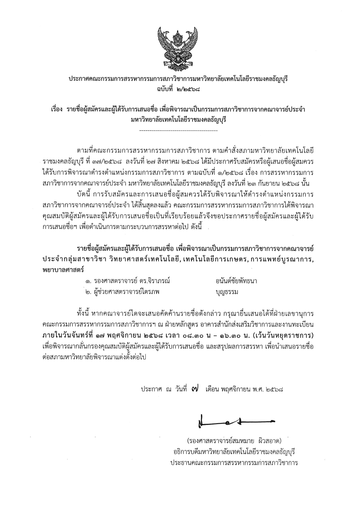 ประกาศคณะกรรมการสรรหากรรมการสภาวิชาการ มทร.ธัญบุรี ฉบับที่ 2/2568