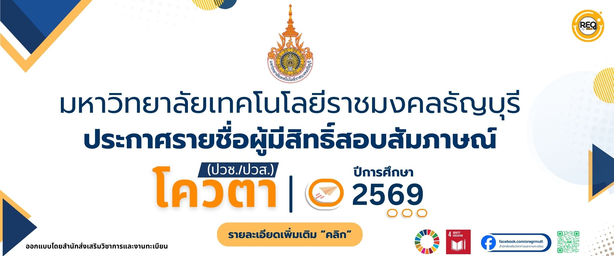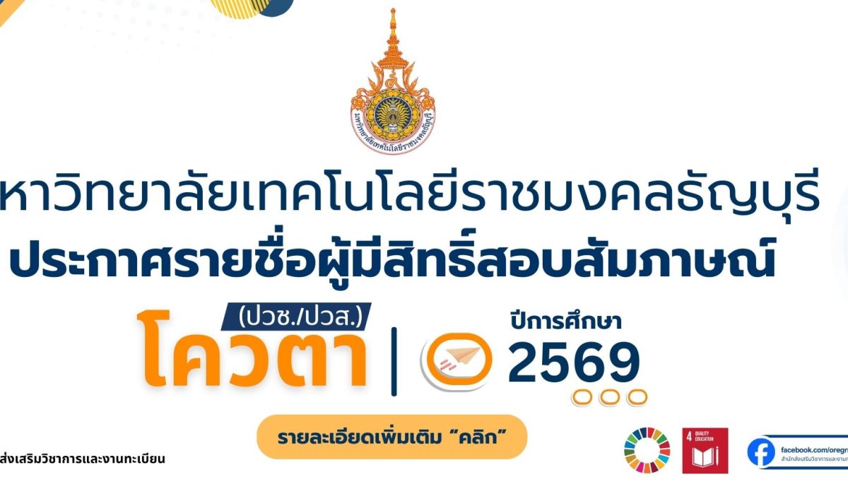 Published by korbnak jaritwong on December 12, 2025 มหาวิทยาลัยเทคโนโลยีราชมงคลธัญบุรี ประกาศรายชื่อผู้มีสิทธิ์สอบสัมภาษณ์ รอบ โควตา (ปวช./ปวส.) ระดับปริญญาตรี ปีการศึกษา 2569 ประกาศ ณ วันที่ 13 ธันวาคม 2568 เวลา 16.00 น. รายละเอียดเพิ่มเติม คลิก Post Views: 35 Share