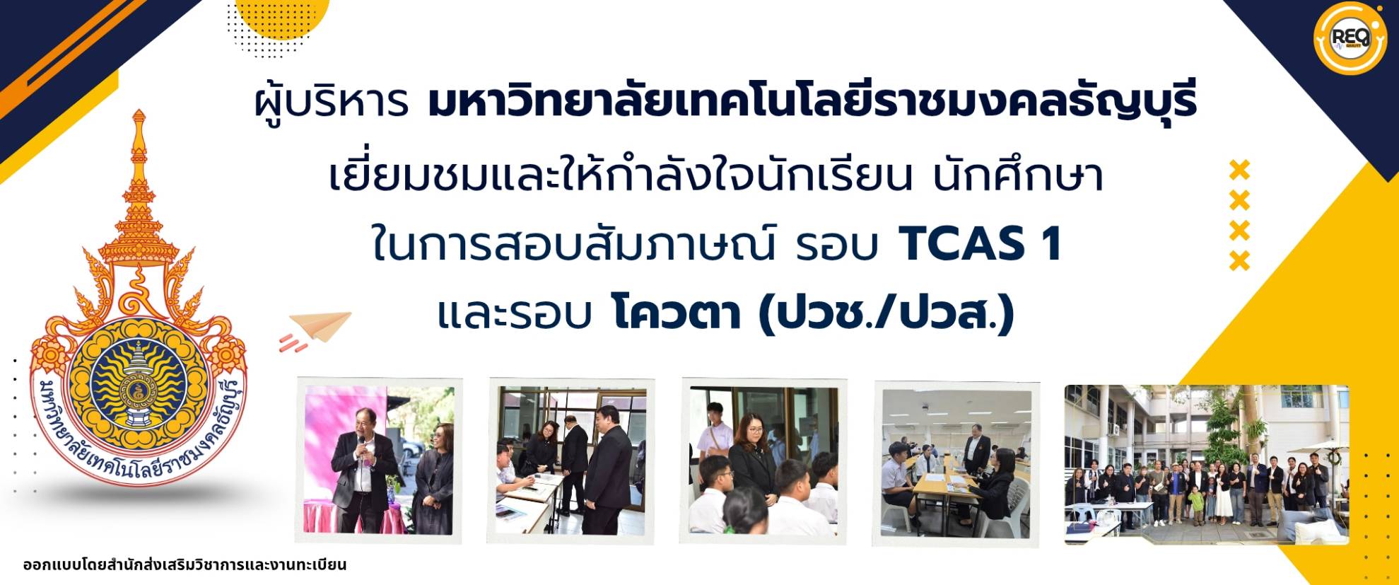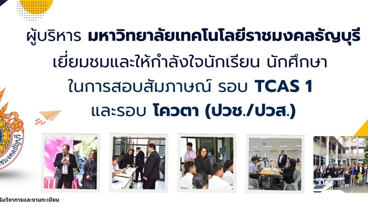 วันเสาร์ที่ 20 ธันวาคม 2568 รศ.ดร. สมหมาย ผิวสอาด (อธิการบดี) ศ.ดร. กฤษณ์ชนม์ ภูมิกิตติพิชญ์ (รองอธิการบดี) รศ.ดร.สุมนมาลย์ เนียมหลาง (รองอธิการบดี) ผศ.ณัชติพงศ์ อูทอง (รองอธิการบดี) ดร.สุทิศา จันทรบุตร และ รศ.ดร. ระพี กาญจนะ (ผู้อำนวยการสำนักส่งเสริมวิชาการและงานทะเบียน) พร้อมทีมผู้บริหาร RMUTT ลงพื้นที่ เยี่ยมชมและให้กำลังใจน้อง ๆ ที่กำลังสอบสัมภาษณ์ รอบ (Tcas1 และ รอบโควตา(ปวช./ปวส.) ปีการศึกษา 2569