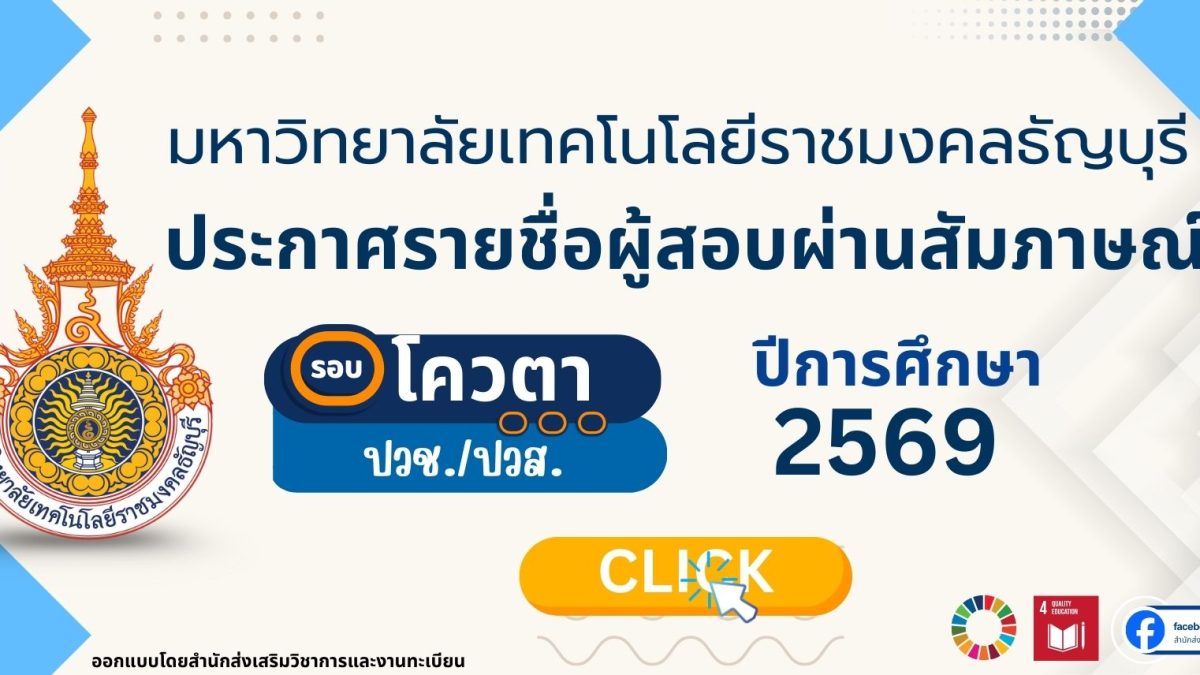 Published by korbnak jaritwong on December 29, 2025 มหาวิทยาลัยเทคโนโลยีราชมงคลธัญบุรี ประกาศรายชื่อผู้สอบผ่านสัมภาษณ์ โควตา(ปวช./ปวส.) ระดับปริญญาตรี ปีการศึกษา 2569 (ประกาศ ณ วันที่ 30 ธ.ค.68 เวลา 16.00 น.) รายละเอียดเพิ่มเติม คลิก Post Views: 1,051 Share