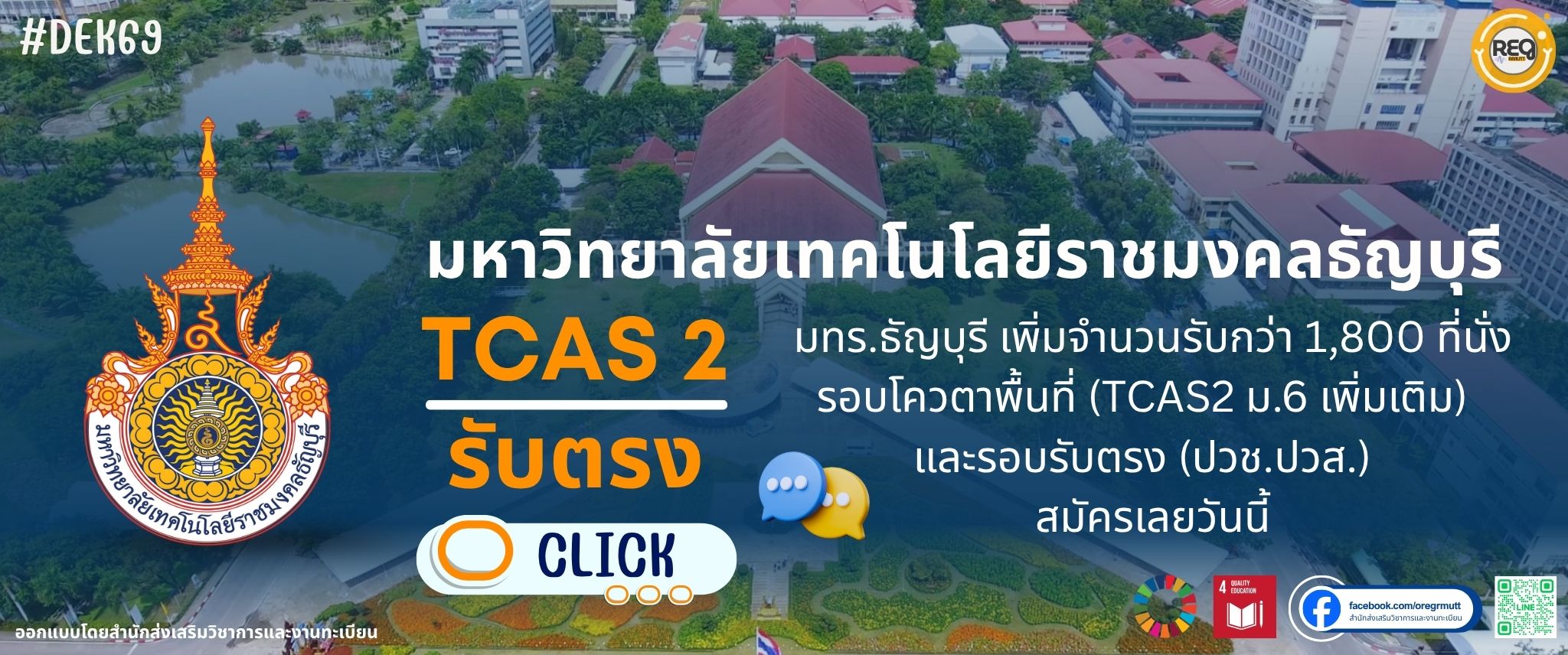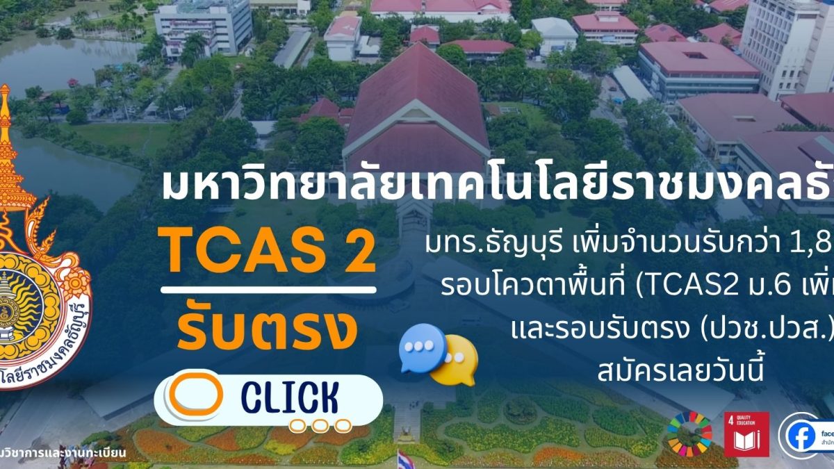 มทร.ธัญบุรี เพิ่มจำนวนรับกว่า 1,800 ที่นั่ง รอบโควตาพื้นที่ (TCAS2 ม.6 เพิ่มเติม) และรอบรับตรง (ปวช.ปวส.)จากสถานศึกษาทั่วประเทศ การเปิดรับสมัครครั้งนี้มุ่งเน้นให้ผู้สมัครมีโอกาส พัฒนาทักษะด้านเทคโนโลยี นวัตกรรม และความคิดสร้างสรรค์ ซึ่งเป็นพื้นฐานสำคัญสำหรับการประกอบอาชีพในอนาคตและการเติบโตอย่างยั่งยืนรายล่ะเอียดเพิ่มเติมคลิก