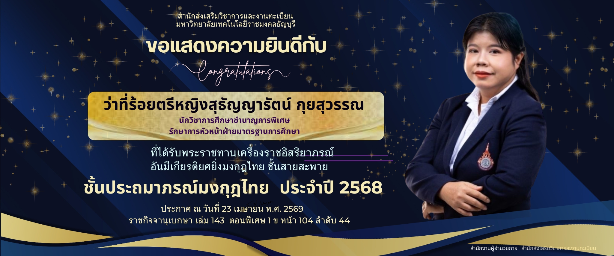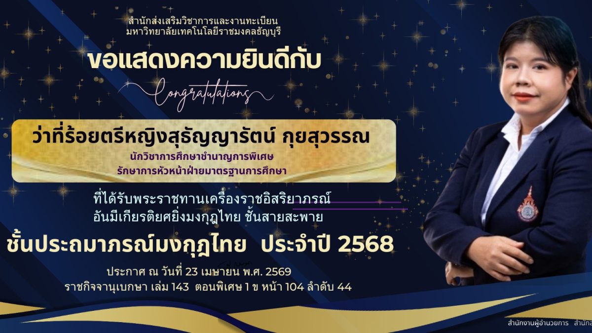 ว่าที่ร้อยตรีหญิงสุธัญญารัตน์ กุยสุวรรณ ที่ได้รับพระราชทานเครื่องราชอิสริยาภรณ์ อันมีเกียรติยิ่งมงกุฎไทย ชั้นสายสะพาย “ชั้นประถมาภรณ์มงกุฎไทย ประจำปี 2568”