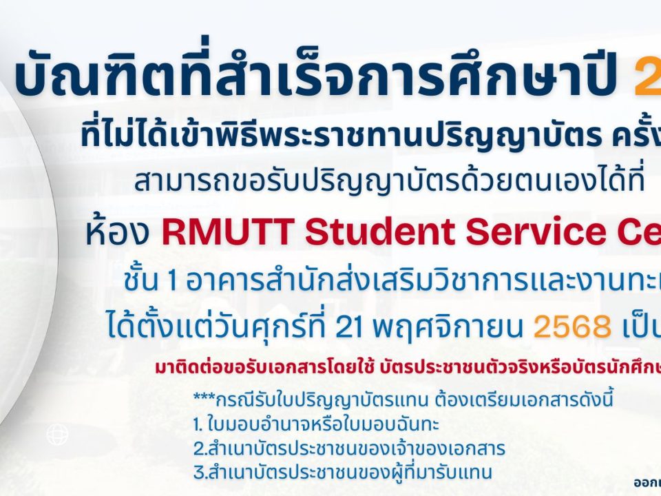 นักศึกษาที่สำเร็จปีการศึกษาปีที่ 1/2567 ที่แจ้งความจำนง รับเอกสารด้วยตนเองหรือที่ไม่ระบุการรับเอกสาร มารับเอกสารสำเร็จฉบับสมบูรณ์ ได้ตั้งแต่วันที่ 26 ธันวาคม 2567 เป็นต้นไป ณ ห้อง RMUTT Student Service Center