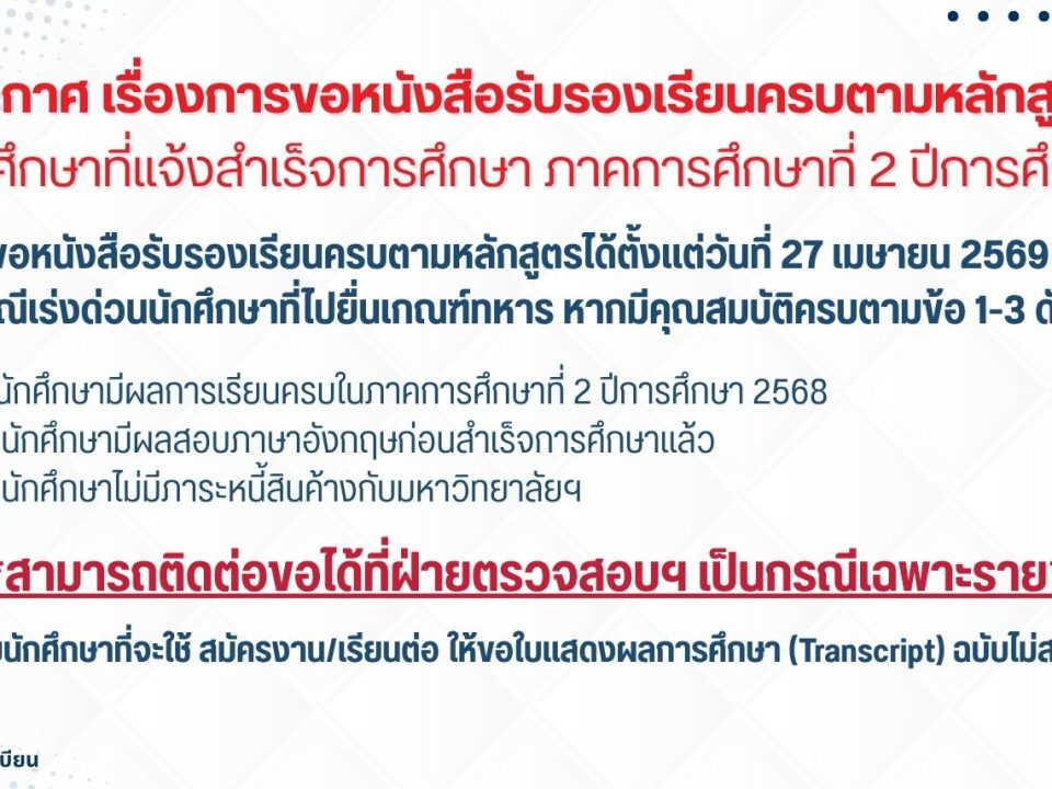 ประกาศ เรื่องการขอหนังสือรับรองเรียนครบตามหลักสูตร สำหรับนักศึกษาที่แจ้งสำเร็จการศึกษา ภาคการศึกษาที่ 2 ปีการศึกษา 2568