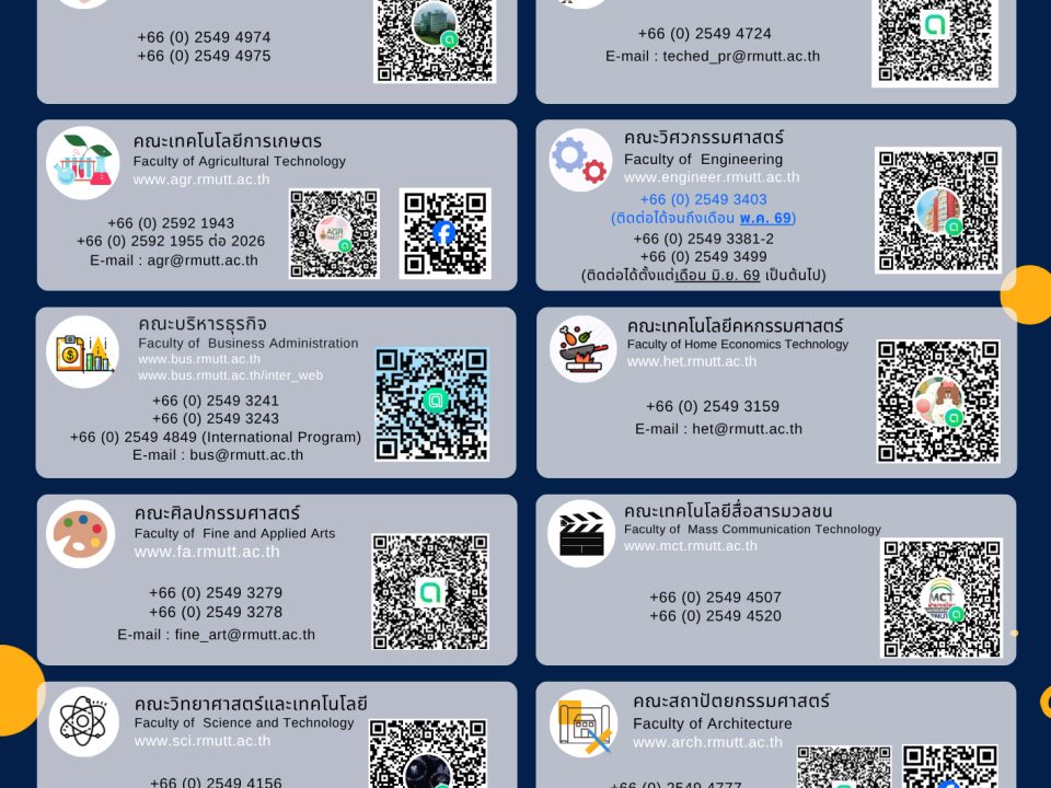 สำนักส่งเสริมวิชาการและงานทะเบียน ประชาสัมพันธ์ช่องทางการติดต่อทะเบียนคณะทั้ง 12 คณะ สามารถโทรสอบถามหรือติดต่อผ่านช่องทางออนไลน์ LINE OA , Facebook ของคณะ เพื่อให้ได้รับข้อมูลข่าวสารที่รวดเร็ว