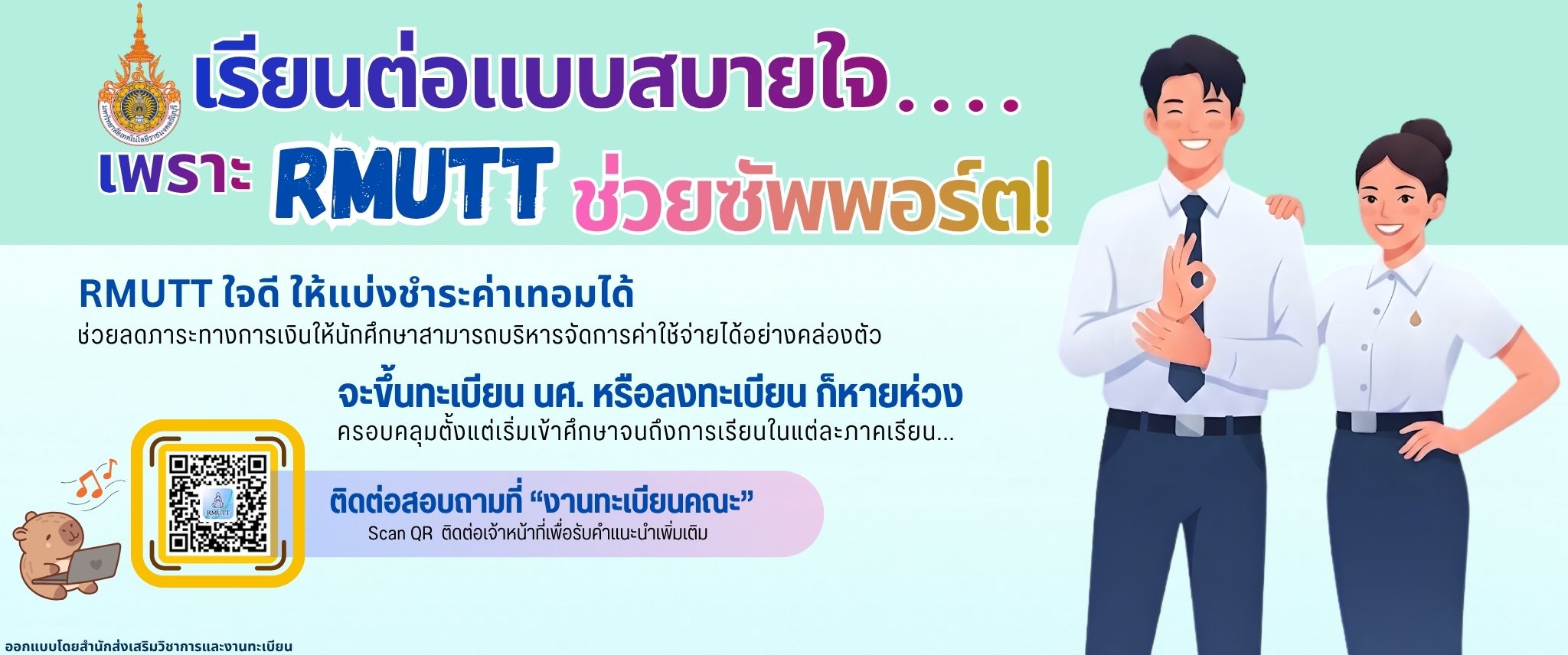 มหาวิทยาลัยเทคโนโลยีราชมงคลธัญบุรี ช่วยซัพพอร์ตนักศึกษาสามารถแบ่งชำระค่าธรรมเนียมการศึกษาได้ เพื่อช่วยลดภาระทางการเงินให้นักศึกษาและครอบครัวสามารถบริหารจัดการค่าใช้จ่ายได้อย่างคล่องตัว หากนักศึกษาต้องการคำแนะนำเพิ่มเติมสามารถ Scan QR ติดต่อเจ้าหน้าที่เพื่อรับคำแนะนำ