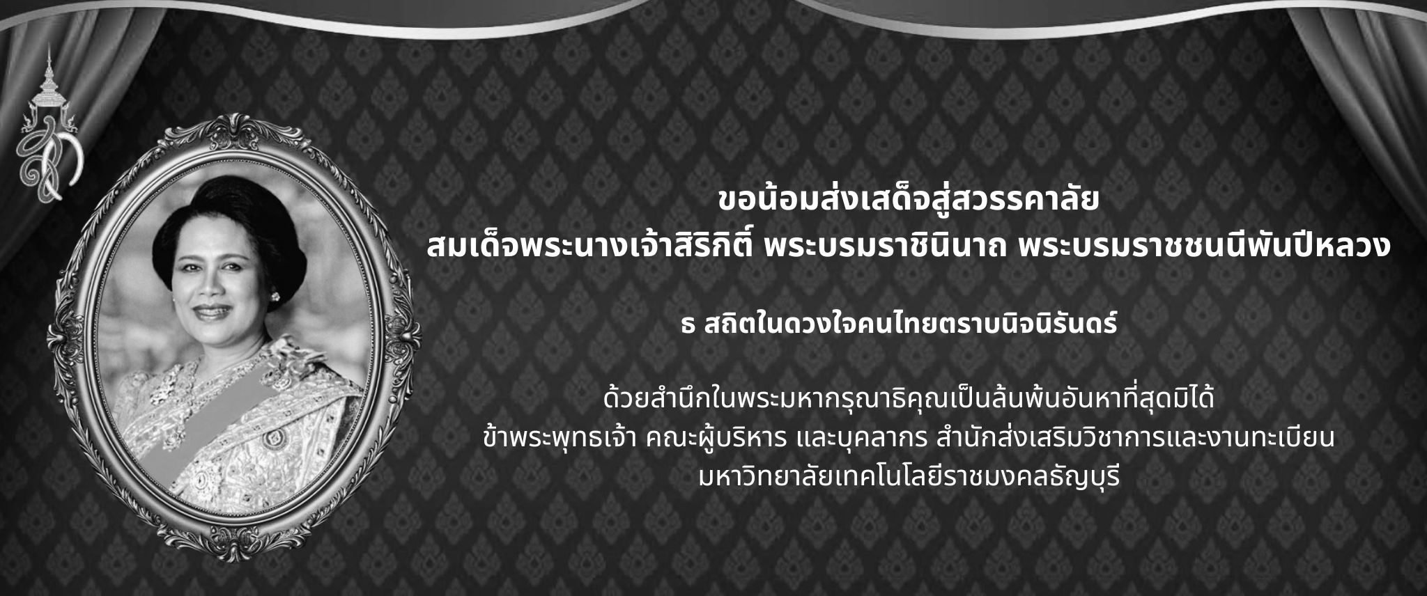 ขอน้อมส่งเสด็จสู่สวรรคาลัย สมเด็จพระนางเจ้าสิริกิติ์ พระบรมราชินินาถ พระบรมราชชนนีพันปีหลวง ธ สถิตในดวงใจคนไทยตราบนิจนิรันดร์ ด้วยสำนึกในพระมหากรุณาธิคุณเป็นล้นพ้นอันหาที่สุดมิได้ ข้าพระพุทธเจ้า คณะผู้บริหาร และบุคลากร สำนักส่งเสริมวิชาการและงานทะเบียน มหาวิทยาลัยเทคโนโลยีราชมงคลธัญบุรี