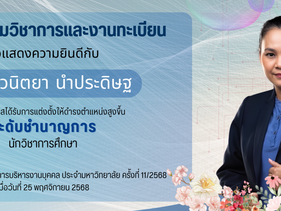 สำนักส่งเสริมวิชาการและงานทะเบียนขอแสดงความยินดีกับ นางสาวนิตยา นำประดิษฐ และ นางสาวกอบนาค จริตวงษ์ ได้รับการแต่งตั้งให้ดำรงตำแหน่งสูงขึ้นระดับ “นักวิชาการศึกษาชำนาญการ” จากมติที่ประชุมคณะกรรมการบริหารงานบุคคลมหาวิทยาลัยฯ ครั้งที่ 11/2568 วันที่ 25 พฤศจิกายน 2568